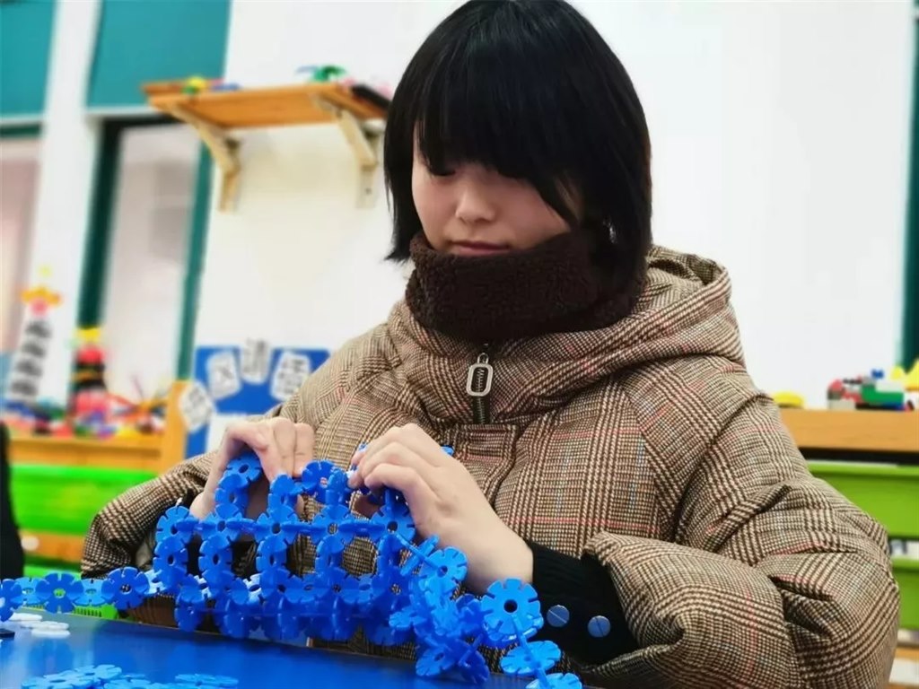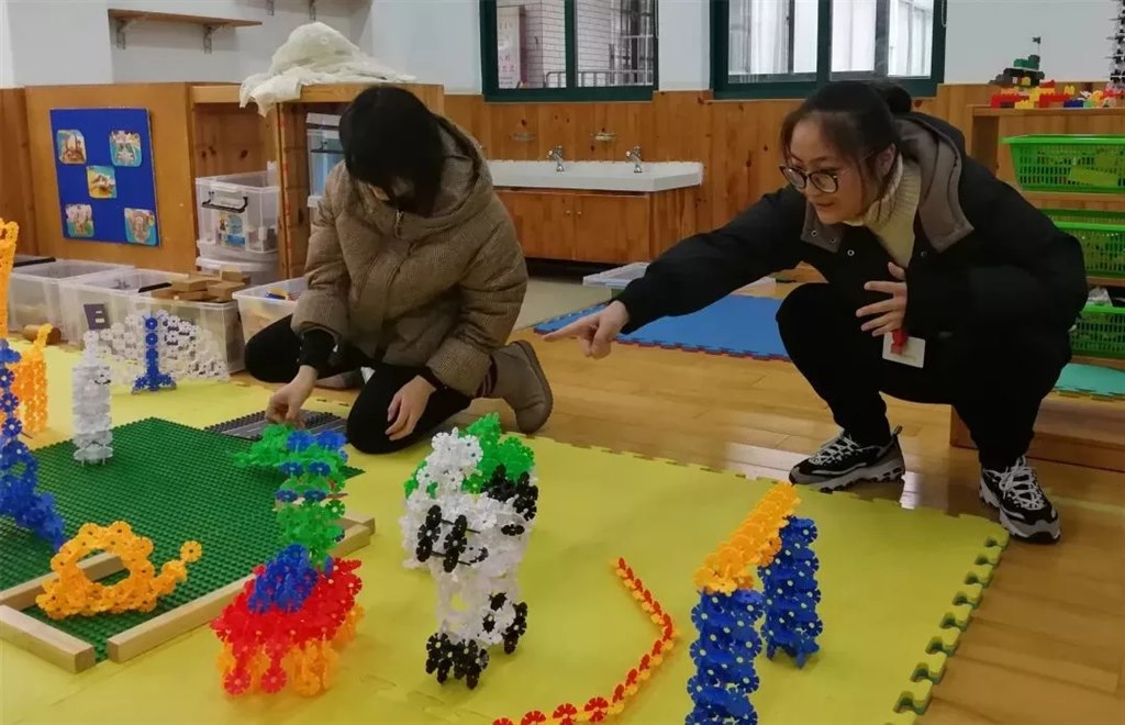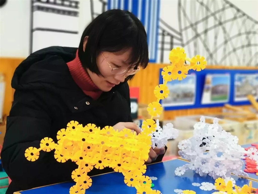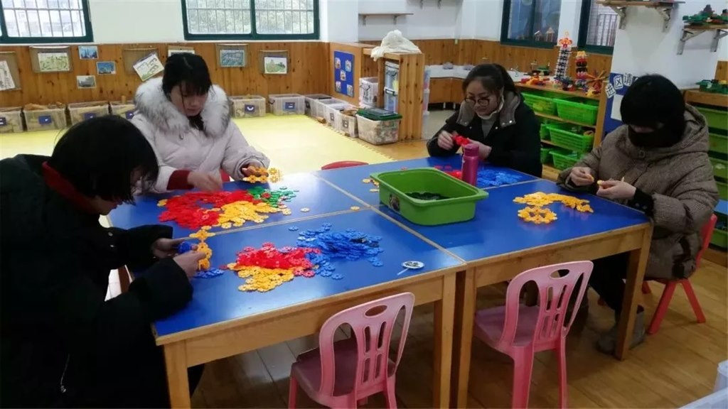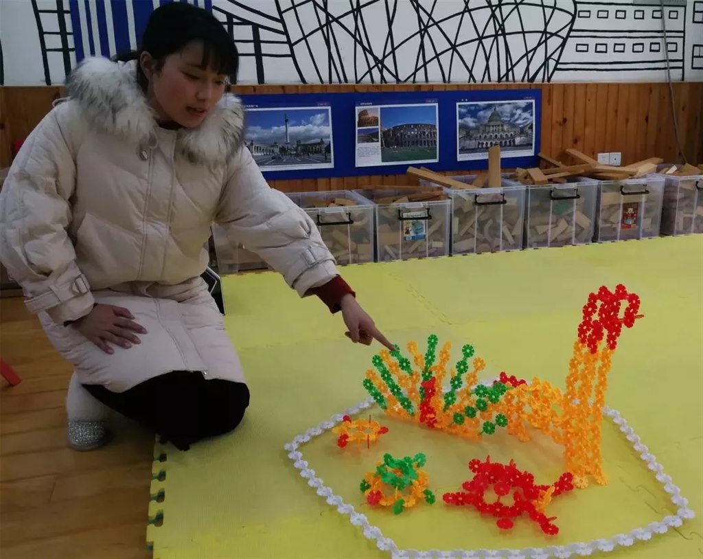 本次考核由两部分组成:1.课堂教学考核——根据主题“新年的故事”不限年龄和领域,自拟教学内容;2.基本功考核——雪花片插塑,教师根据插塑创意构造。