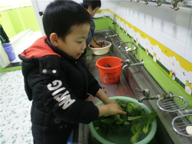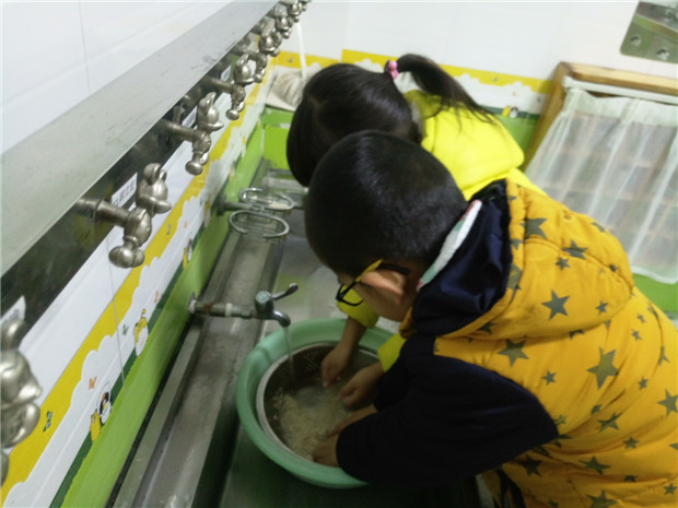 为了让厨师叔叔早点烧好腊八粥,1月11日,一吃完午饭,孩子们就在盥洗室内把要来的粮食进行了清洗。“老师,红枣在水面上,都漂起来的。”“山芋好大呀,我都想吃了。”“老师,我的米为什么老是漏出去?”孩子们边干着活,边说着自己的发现。劳动也能这么有趣!