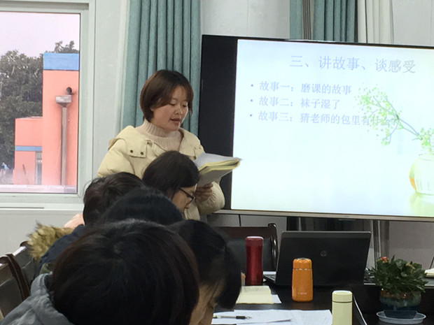 在接下来的议程中,首先由耿苗老师带来的“磨课的故事”,故事讲述了苗苗老师在这次区督查活动中自己一研、二研、三研的感受,这是一个教师怎样落实从一纸教案到课堂的真实故事,看到了老师在这一次次磨炼中的成长。接下来的故事“袜子湿了”讲述了管理者的无私奉献的服务事迹,树立的是“做好自己,影响他人”的管理形象。最后一个故事“老师包里藏了什么?”则是从孩子的角度讲述了老师怎样做到关注细节、严以律己、为人师表。