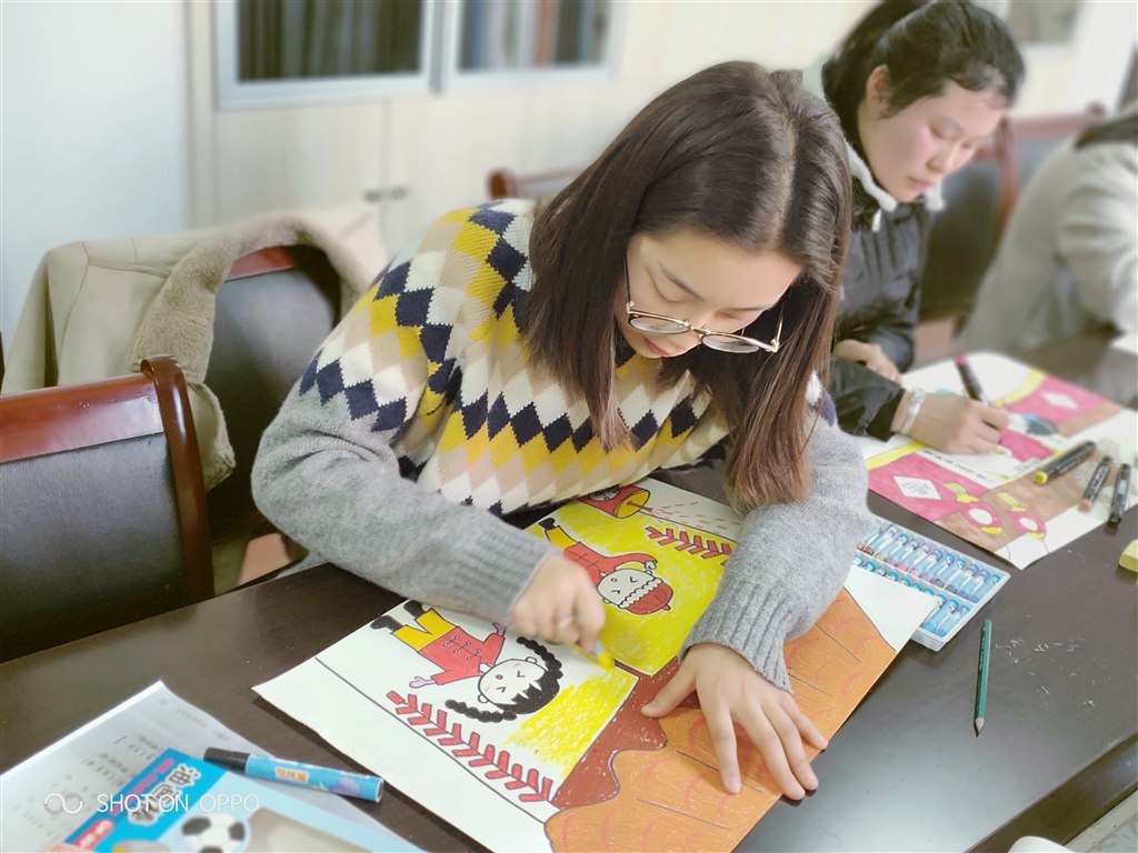 老师们在涂涂画画的过程中一幅幅“红红火火的年”呈现给大家,只见每位老师的绘画主题鲜明,色彩鲜艳。尤其李旻玉老师的绘画作品形象鲜明突出,有吸引力;邹榴玉老师的作品想象力丰富、构图饱满;张钰等其他老师的绘画线条流畅、主次分明;老师们的作品充满了童趣、有创意,大家对新教师的绘画功底赞不绝口。