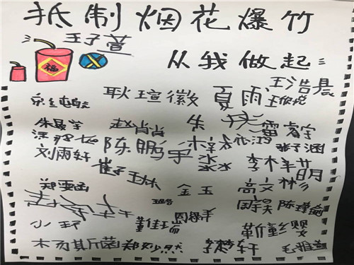 孩子是课程的主人,在了解了燃放烟花爆竹的危害性后,孩子们懂得了作为社会的一员,要从小事做起,从不燃放烟花爆竹做起。他们自主设计、制作了抵制烟花爆竹海报,并签上了自己的名字。小手拉大手,孩子们除了自己要做到,还邀请爸爸妈妈也参与到抵制烟花爆竹的行列中来,设计了亲子联名海报,将意识落实于行动中。