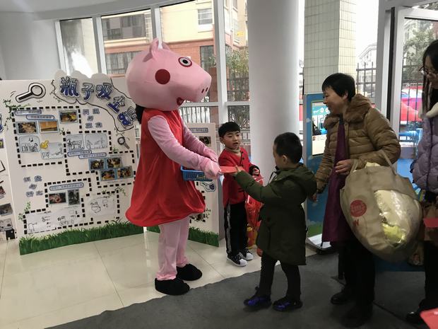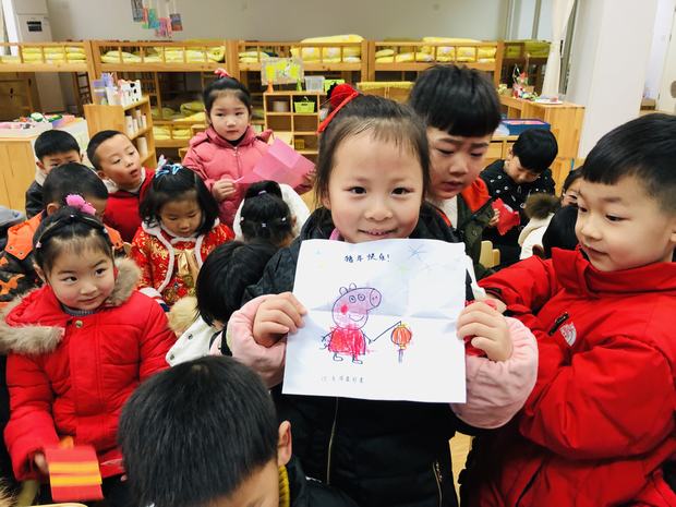 一早,随着第一位幼儿的到来,“佩奇送红包”的迎新活动正式拉开了序幕。孩子们在小猪佩奇、乔治热情、亲切地迎接下,一个个惊喜万分地接过各种各样的创意红包,满怀愉悦的心情来到教室。和老师互问新年好后,他们迫不及待地打开红包,更是喜不自禁,里面有的是几句祝福语,有的藏了一朵小花,还有的放了一幅画……每一个红包都蕴藏着家长、老师对孩子们的美好祝愿。