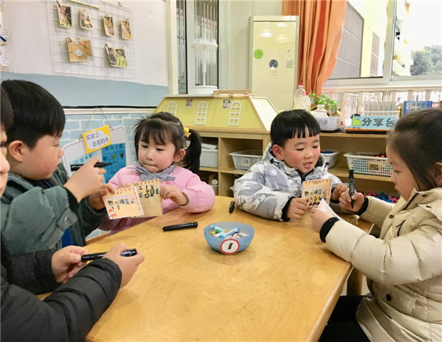 开学第一天,孩子们带来了寒假和爸爸妈妈共同制作的花灯,并将花灯悬挂在走廊和教室。在孩子们的装扮下,幼儿园弥漫着浓浓的节日氛围。根据前期调查中统计出的游戏项目,各班孩子投票选出了本班所要开展的班本化游戏项目,并根据选出的游戏项目就“游戏玩法、材料准备、人员分工、奖励措施”等方面制定游戏计划。“我在迪诺水镇看到了许多漂亮的花灯,那我们班就做花灯吧!”“做花灯需要一些彩纸、剪刀、胶棒,这些都要提前准备好。”中一班的孩子们热闹的讨论着。“庙会里套圈圈游戏有很多奖品,我可以把我的玩具带来分享。”“那每个小朋友需要几个圈呢?”中六班的孩子正在商量套圈圈游戏的玩法。同时,各班孩子们也设计了游戏时使用的集星卡,“我们把每个游戏都画在集星卡上,参与游戏后就能得到贴花奖励。”就这样,孩子和老师共同创设班本化的游戏,充分利用家长资源搜集活动需要的材料。基于前期制作戏剧海报的经验,孩子们分工合作,寻找材料,自己动手制作班本化的元宵节游戏宣传海报,为“元宵喜乐会”游园活动做好充足准备。
