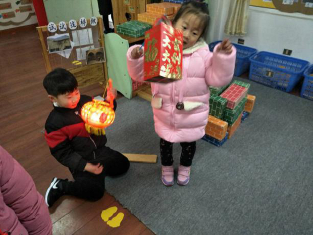 瞧!一盏盏新颖独特、创意无限的花灯都是孩子和家长手工制作的。有红包编成的兔子灯、有杯子制作的荷花灯、有纸糊成的南瓜灯、有荆条编成的小鱼灯、有纸盒装饰的房子灯、还有气球灯……孩子们提着自己心爱的花灯相互交流着、欣赏着,各个神采飞扬。