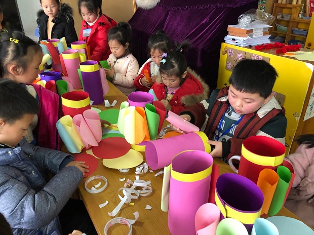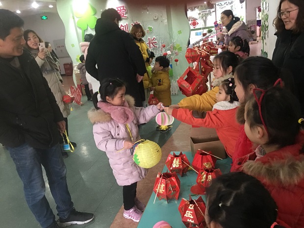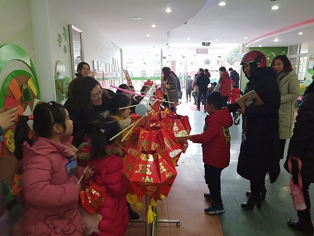 大班级组以“做花灯、筹义卖”的形式开展了闹元宵活动。活动开始前,教师先利用视频、图片、故事、多媒体课件等方式帮助幼儿了解元宵节的来历和传统风俗习惯,又让孩子们欣赏了各种花灯图片,了解了花灯的寓意。接下来老师简单介绍制作过程后,孩子们便迫不及待地自主选择材料:拿起彩纸、剪刀和胶棒,以饱满的热情投入到了制作中。不一会儿,在孩子们的巧手下,一盏盏鲜红亮丽的花灯便出炉了。放学时,大班孩子们跟着老师一起在大厅进行义卖活动。负责销售的孩子们忙碌地推销着,叫卖声此起彼伏。小中班的弟弟妹妹们跟着爸爸妈妈在每个绚丽的元宵灯前流连忘返,挑选自己中意的花灯。活动中,孩子们义卖着自己亲手制作的花灯,感受着元宵节欢乐、喜庆、祥和的气氛。