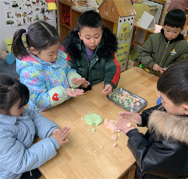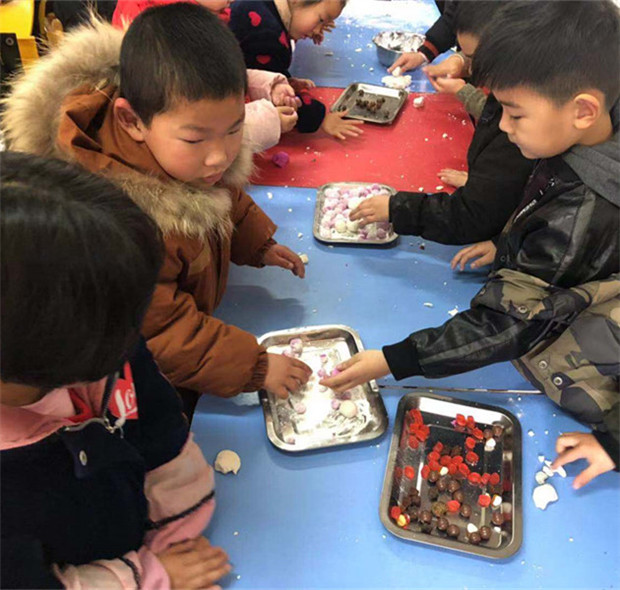 大班的哥哥姐姐们带来了制作汤圆的糯米粉,还有各种各样的汤圆馅呢:Q弹的软糖、浓郁的巧克力、绵密的豆沙、热辣的牛肉干。当然想要做成花样元宵光各种各样的馅还不够,汤圆的颜色也是千变万化:红心火龙果、翠绿的菠菜、鲜甜的紫甘蓝……榨成五颜六色的汁,与糯米粉结合在一起,彩色汤圆的皮就出来了。热腾腾的汤圆出锅,一口咬下去QQ糖化成了酸甜的果汁、巧克力入口即化,汤圆皮软软糯糯,孩子们吃在嘴里甜在心里!
