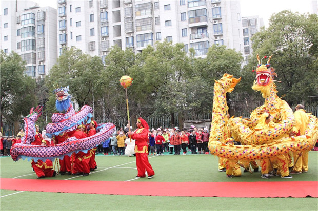 舞龙队来啦!红艳艳的红龙和金灿灿的黄龙,让我们眼前一亮。在有节奏的锣鼓声中,两条龙一会儿飞舞,一会儿盘旋,一会儿双龙戏珠……就像神龙在九霄之上、云彩之巅嬉戏、逗闹,极为美妙,引得我们不停地鼓掌叫好!