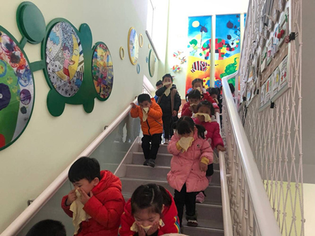 随着一声消防预警信号的响起,各园区的幼儿在班级教师的带领下,拿起湿毛巾,捂住口鼻,按紧急预案的疏散线路,弯着腰小步快走,分两道楼梯井然有序地撤离。幼儿到达指定的安全场地后,各班班主任迅速清点人数,及时向园区保教主任汇报。