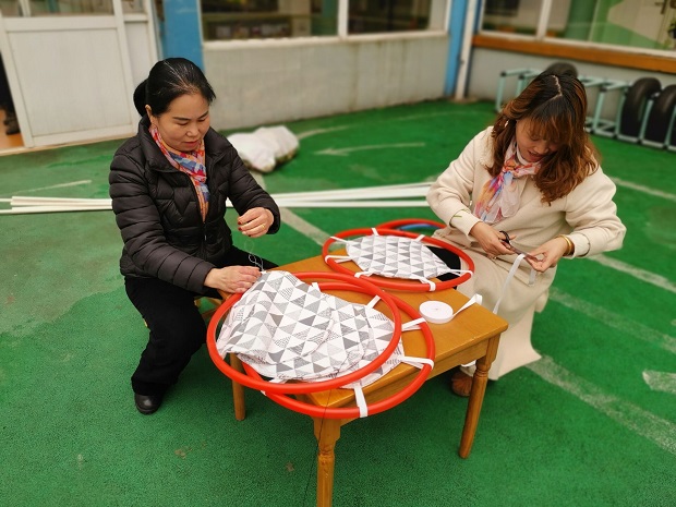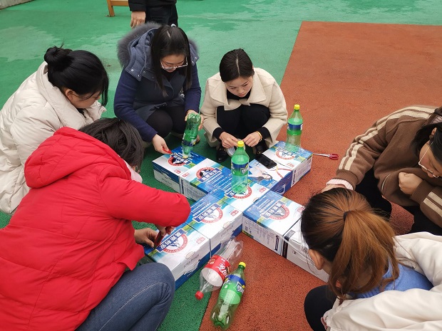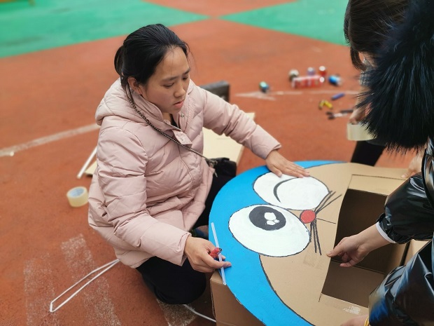 3月1日下午,老师和家长们一起在塑胶场地开始了教玩具的制作,发挥每一位教师、家长的聪明才智,制作适合不同年龄段幼儿的体育器械。一些在常人眼里一文不值的废旧物品到了她们手里却变成了“宝贝”——用被单做成的打地鼠;用纸箱、报纸球做成了打保龄球等;用布做成了球拍;用纸盒做了投掷物等等。这些器械材料虽然都是利用生活中简便易得的材料制作,却具有趣味又蕴涵着多元的教育价值,体现了我们老师和家长的创意与智慧。