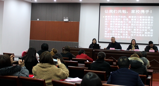 在充分肯定了家委会代表的发言后,沈亚东校长用热情洋溢而又图文并茂地作了总结致辞。他从抓住机遇建学校、政府重视是保障、三年循环结硕果及其深层原因等层面,向大家多角度、全方位地介绍了滨江中学的现状、定位和发展方向。他特别指出:教育是无处不在的,教育的力量和价值是不可估量的,但教育又是潜移默化的。学校和家庭为了孩子的前途能够看多远,孩子就能走多远。我们注重孩子的什么,孩子就会在什么方面有收获。许多的改变从教育开始,而教育没有“假如”。滨中不是培养只知道埋头学习的孩子,而是培养充满活力、思维敏捷、有探究精神、善于交流的未来优秀人才!尽管过程复杂,但让我们家校携手,凝心聚力,加速孩子的发展,谱写家庭教育和学校教育的全新篇章!