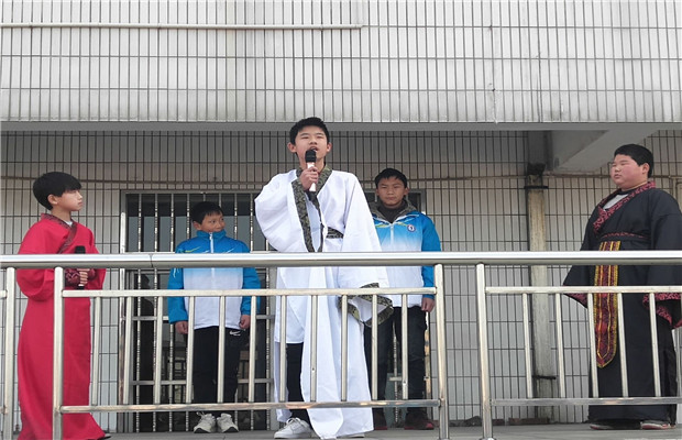 仪式上,初一(4)班学生代表和全体师生分享了经典诵读《孙权劝学》,在七四班5位同学的演绎下描述了吕蒙在孙权劝说下开始学习,之后大有长进的故事,也赞扬了孙权、吕蒙认真学习的精神,并告诫同学们学习的重要性。学生代表穿着古代服饰,语言简练生动,以对话表现人物,言简意丰,生动传神,极富表现力,洪亮的声音活灵活现塑造出人物形象,突出了此次书香阅读的目的。并号召同学们积极参加学校“感受读书之乐,传承中华经典”读书节系列活动,通过诵读国学经典,弘扬中华民族传统美德,养成良好的行为习惯,要把读经典当做是一种享受,让浓浓的书香永远飘溢在安中的校园。此次七四班的同学带来的经典诵读节目,深情的朗诵带给全校师生心灵的激荡。