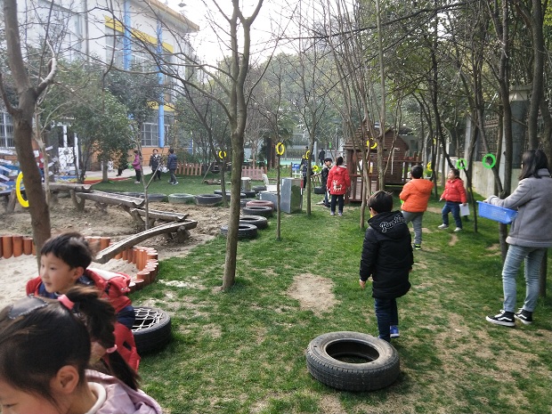 孩子们就最后的统计结果,进行了验证同伴的方法,并开始用自己喜欢的方法行动起来。有的孩子在树上绑毛根,有的孩子用纸条粘上做标志,有的孩子用“贴烧饼”的方式,还有的用我们做操的呼啦圈做记号……最后孩子们用呼啦圈的方式统计出我们的幼儿园一共有85棵树。