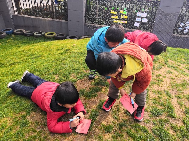 孩子们找到安全隐患后,迫不及待地给发现的安全隐患设计了安全标记,看,有的孩子趴在草坪上,有的孩子伏在桌子上,有的孩子坐在小石礅上,认认真真地画着安全标记,宛如真的安全管理员呢!