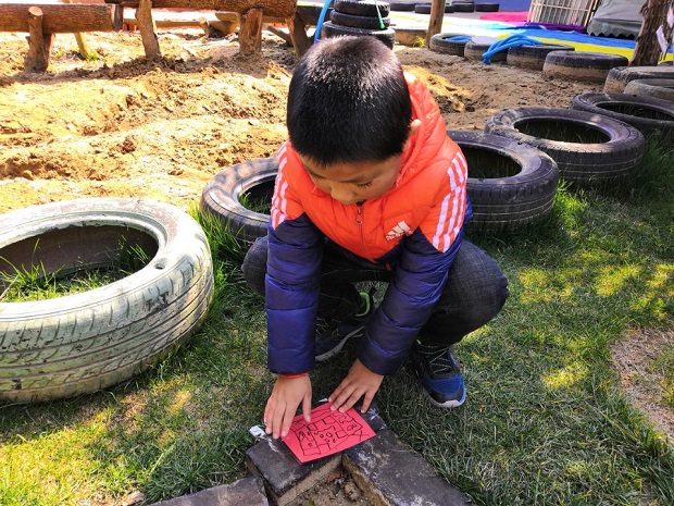 最后孩子们把自己的安全标记张贴在各个安全隐患处,看着自己的劳动成果,孩子们露出了甜甜的微笑。
