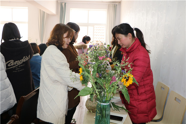 活动主要分为两个环节,首先从欣赏毕淑敏的散文诗开始,在缓缓的音乐声和老师深情的朗诵中,我们感受到作为新时代女性的责任和光荣,随后女教工们开始畅所欲言,交流如何平衡日常的工作和生活,怎样才能获得真正的幸福感和成就感。活动的第二个环节为花艺学习,我们请了花艺师现场为女教师进行插花培训,解释花儿密语,随后女老师们亲自动手尝试,你插了一瓶康乃馨,我插了几支向日葵,你的花儿真好看,我的也一样赏心悦目。