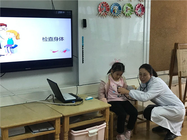 身穿白大褂的医生是谁?原来是华睿琦妈妈和鲍梦凡妈妈。她们结合自己精心准备PPT课件和常用的医疗实物器械等“教具”,通过课件展示、情景表演、实验演示、实物演练等形式,让孩子们更深刻地了解了医生的工作,知道正确洗手、牙病预防、眼睛保护、疾病预防等卫生保健知识。