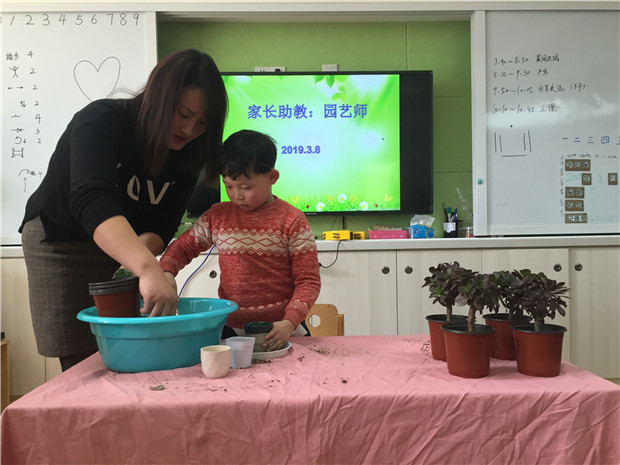 郭家润妈妈是名园艺师,她带着多种多肉植物来到了幼儿园。小米星、玫瑰、粉牡丹……郭家润妈妈为孩子们介绍了四种植物的名称,并且邀请大家亲自体验多肉植物的种植!第一步:在花盆里填上一小半的营养土,第二步:把植物放进去,第三步:继续填土至花盆顶端一指的距离。园艺师妈妈在手把手地教孩子们种植的同时,也给大家讲解了常见多肉植物繁琐的的养护方法。让大家不禁感慨:照顾植物也像照顾小朋友一样要付出时间和精力,园艺师的工作也很辛苦!