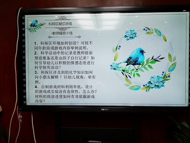 “教师在科探区的重点工作在于观察,从观察中发现孩子的兴趣,并为孩子层层递进的提供材料和创设环境。”最后在张园长的引领中结束了本次科探区园本培训,但是我们关于科探区的学习与研讨还在继续前行的路上。