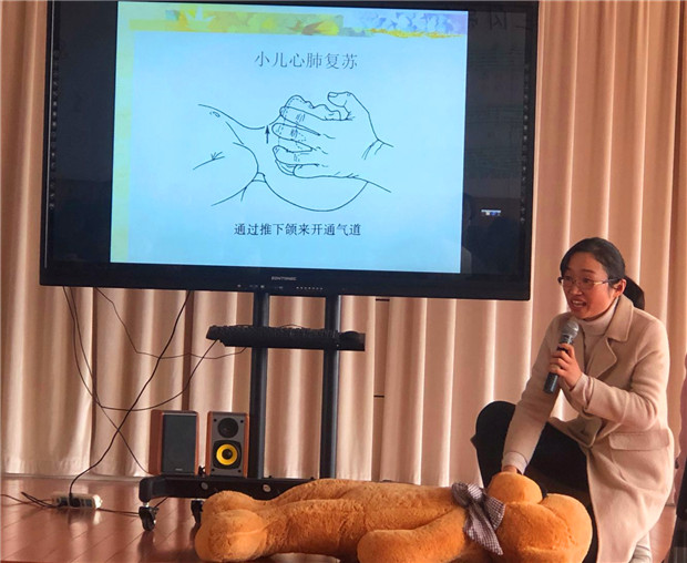 为更科学、更专业地守护幼儿安全健康,提高教师的安全意识,增长教师的急救知识,保证幼儿在园的生命安全,2019年3月25日中午我园特邀三井人民医院潘旭雅医生组织全体教师进行幼儿常见意外事故的急救处理讲座。
