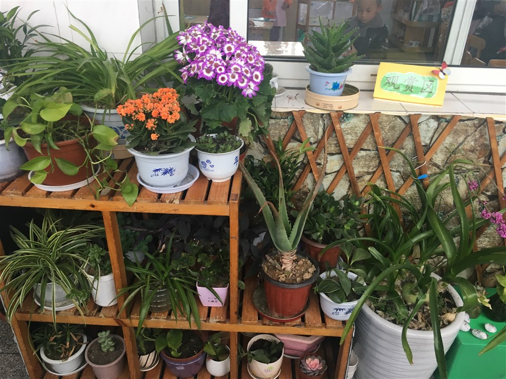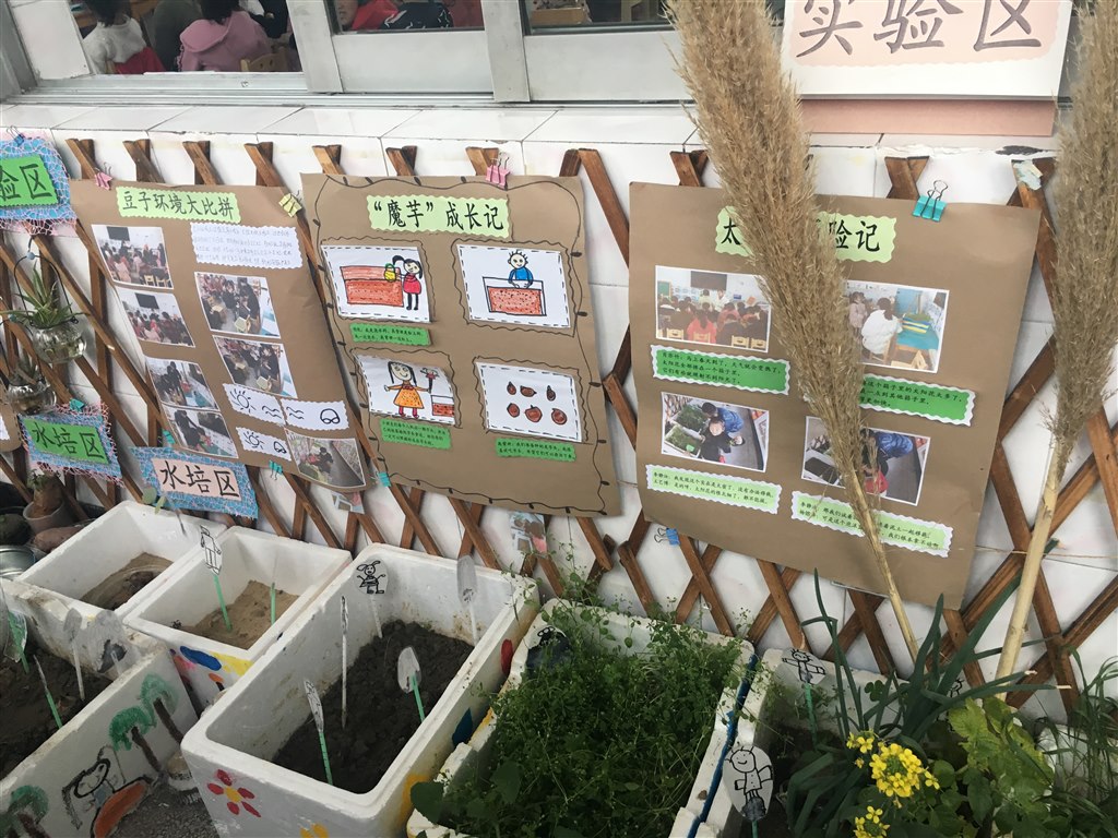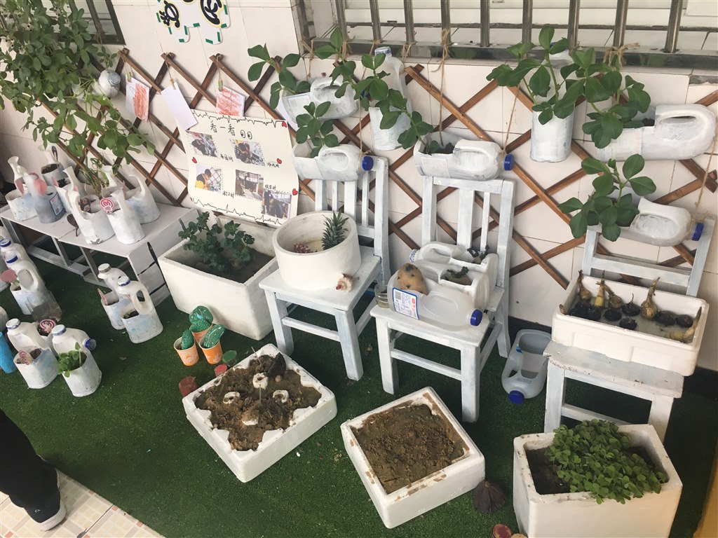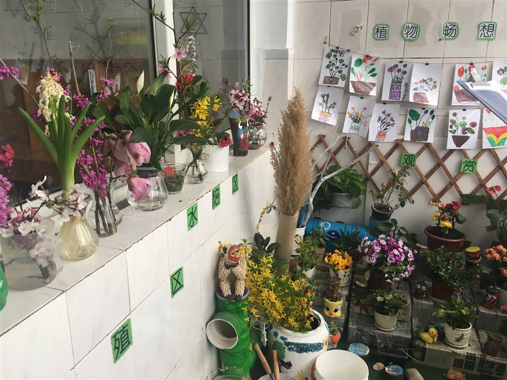 各班充分挖掘生活资源,根据本班幼儿的年龄特点、兴趣,抓住季节特征,因地制宜对班级自然角进行了精心规划和设置,创设出别具特色的自然角:大班重在实验观察,知道种子发芽需要雨露、阳光和土壤;并用写生的方法把观察到的种子发芽和花朵变色等小实验记录下来;中班的自然角区域设置分明,有种植区、观赏区、饲养区等应有尽有,新颖有趣;小班从幼儿年龄特点出发,物品摆放错落有致。在创设中教师们奇思广益,旧物改造制成各种花盆、合理利用空间,摆放有序,自然角成了一个生机勃勃的绿色生态园。