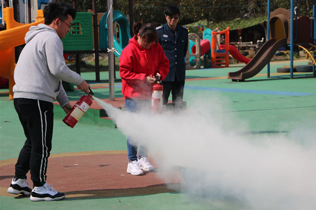 3月26日下午14:40,火灾警报音乐急促响起了,此时的幼儿正在投入的游戏中,听到警报音乐想起,孩子们迅速作出反应,在教师的提示下,拿起潮湿的毛巾折叠多层捂住口鼻,随着教师的引导超朝户外跑去。在1分30秒的警报音乐结束前,全体幼儿和老师全部安全撤离到操场。接着,组织活动的苏老师与幼儿用互动的方式展开讨论,让幼儿明白在日常的生活中不能玩火,如果发生火灾该用怎样正确的方式进行逃生。演练的第二项内容是模拟扑灭明火,现场随机请了两位老师示范灭火器的使用方法,两位老师能按照正确的程序打开干粉灭火器,扑灭了火盆中的明火。