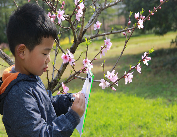 经过30分钟的徒步行走,孩子们到达了目的地——高铁生态公园。一进入公园,孩子们就感受到春天的气息:成簇的迎春花、成片的垂丝海棠、张开“翅膀”的蝴蝶花,还有偶然一见的蒲公英,满满的“春风花草香”。还有那让孩子们感兴趣的小动物们,飞舞在花丛中的小蜜蜂,小水池里的成群蝌蚪,无不诉说着春天的到来。孩子们纷纷拿起手中的画笔将自己看到的、听到的、闻到的、喜欢的、一切所能感知到的记录在了纸上。孩子们笑着、跳着,掩饰不住激动与喜悦,沉浸在和同伴游玩带来的欢乐中。