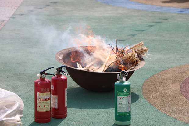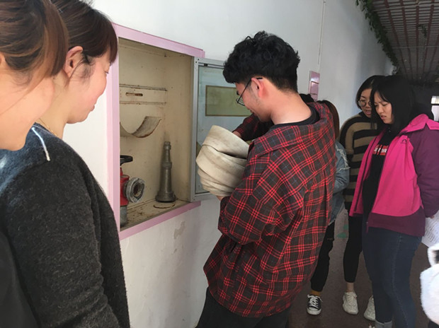 本次培训从2种消防器材入手,一个是灭火器,每位教职工都知道哪些地方有消防器材,但有些教职工从未使用过,也不知道具体的使用方法,所以我们准备了火盆,现场随机请了3位教职工使用灭火器模拟扑灭明火,3位老师能按照正确的程序打开干粉及水基型灭火器,扑灭了火盆中的明火。另一个是消防栓,负责安全的苏琴老师示范了如何将消防栓正确取出并装好的过程,并随后请2位教职工进行现场操作,模拟扑灭2楼上的火。