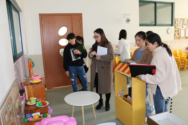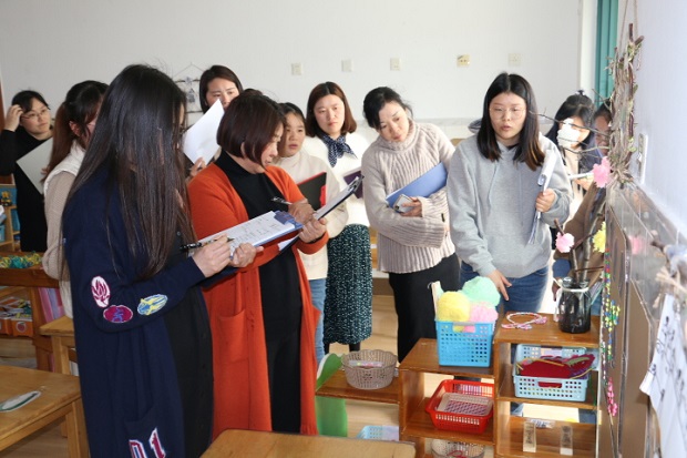 在环创组张莉老师的带领下,活动中老师们带着欣赏的眼光、学习的心态进入每一个教室,并对班级环境提出亮点和建议。从本次观摩的整体情况来看,老师们在布置环境时考虑到让幼儿做主,比如区域环境中呈现过程性故事、孩子的作品、游戏中的方法与问题、材料与标记等都体现了孩子的足迹。此外,老师们还将环境与当下主题、季节性、孩子的兴趣需要相融合,做出了班级特色。从大班到小班,老师们感受到了年龄段差异所呈现的不同环境,更体会到了环境与材料的重要性。