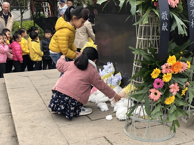 战争的年代照就了烈土们的勇敢与坚强,和平美好的环境为我们提供了学知识、长才能、为祖国奉献的机会。我们有信心,因为我们有榜样!同学们,我们是时代的幸运儿,我们应该懂得幸福生活来之不易,我们更应该懂得所肩负的历史责任和历史使命。我们要爱自己,更要爱祖国,我们要发奋学习,为她增光,为她添彩! 最后,孩子们给革命烈士献上了自制的菊花和鲜花,向恽代英致敬!