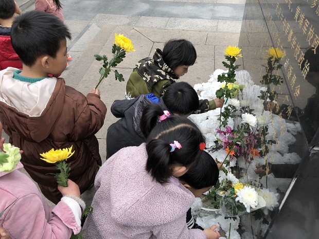4月4日上午小朋友在老师的带领下,排着整齐的队伍,怀着对革命烈士无比崇敬的心情来到了恽代英广场,一个个面带严肃而崇敬的心情,向革命烈士恽代英默哀致敬,缅怀先烈。