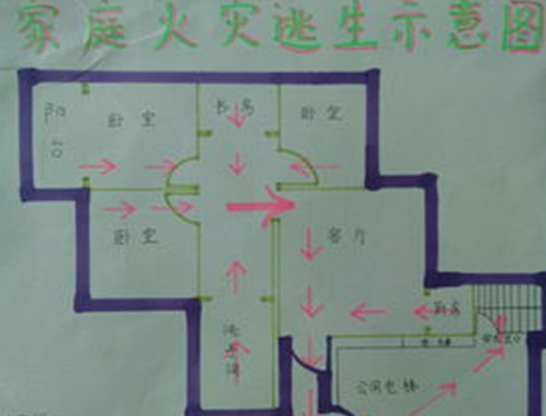 “当发生火灾了,你在家会怎么做呢?怎么逃生呢?”每个家庭的格局是不一样的,如果家里发生火灾,幼儿是否能快速地逃离到安全的地方呢?于是,我园开展了“逃生路线我知道”活动,每位家长都能积极参与,和幼儿一起绘制自家的逃生路线图,加深了幼儿的安全防护意识。