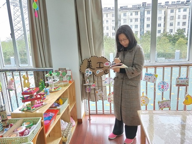此次观摩班级为中4班。参加活动的老师们带着观察目的:区域游戏后幼儿(管理员)整理的情况进行现场观摩。活动中,老师们分别观摩幼儿游戏后的整理行为、听取了曹莲老师区域后的谈话。活动过程中,老师们时而就现场观察进行实时记录、时而对照区域整理情况进行记录,为研讨环节提供有效保障。