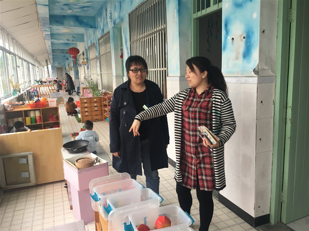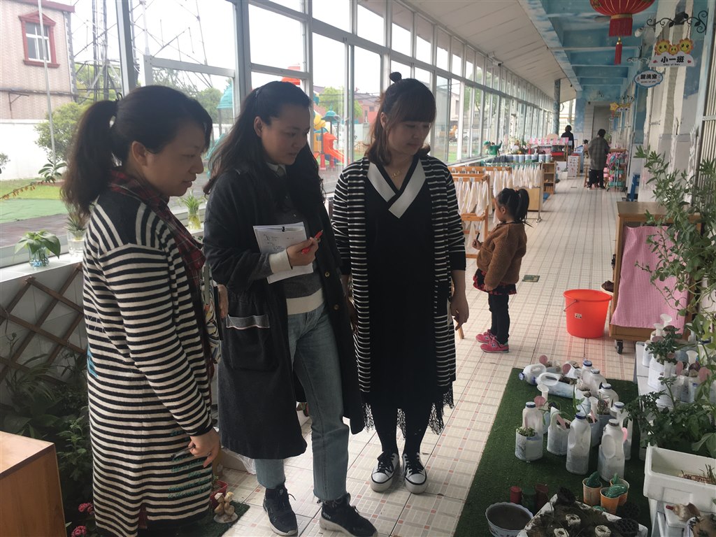 随后,藻幼的老师分别观摩了我园的户外环境及小、中、大班的区域游戏现场,在这个常态的游戏活动中,我园的自然角创设及美工区的材料投放让藻幼的老师们眼前一亮,她们边看边进行记录,及时与班级老师沟通,了解班级老师的想法,并提出了一些宝贵的建议。