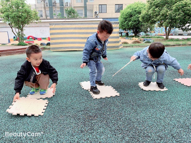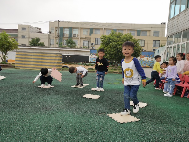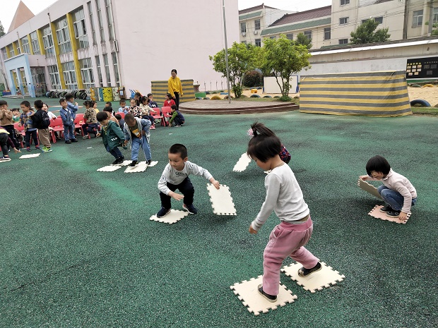 蒋老师宣布《踩石过河》游戏开始后,孩子们跃跃欲试,都想当个小勇士。他们用小海绵垫子当石头,老师说:小河里有水,要踩在石头上过河,到对面去采蘑菇,看哪一队伍釆的蘑菇最多才是胜利者。比赛中,有的孩子小心翼翼地踩着小石头,生怕掉进“小河”里;有的孩子大步的向前迈进,想要为班级争光。游戏进行的热火朝天,小朋友们在快乐中不仅锻炼了自己,同时又增强了自己的能力,他们一张张开心的笑脸,成为了我们幼儿园里又一道亮丽的风景线。