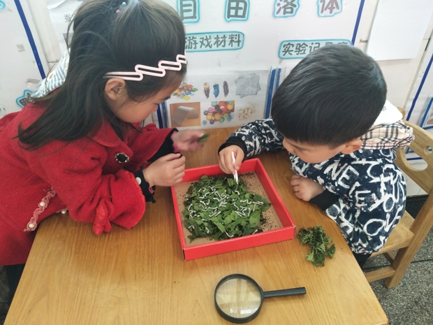 区域游戏时间,周筠龙小朋友最喜欢在科探区观察蚕宝宝。有一天,他和另外两个小伙伴一起给蚕宝宝换桑叶,发现了黑黑的东西,问佳旭:“这里面好多黑色的东西是什么呀?”“我也不知道”,后来我们一起查阅资料才知道那是蚕沙,可以做药也可以给植物当肥料。