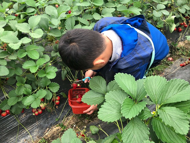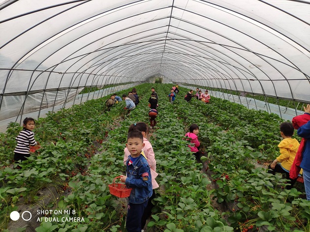 活动中,他们有序地排队进入草莓园,按照草莓园的庄主指示,每一个班在一个棚子里。