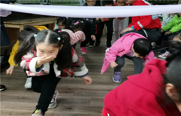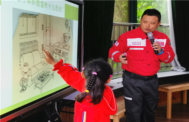 讲座一开始,黄队长展示了一张客厅的图片,让孩子们寻找房间里的安全隐患。由于有以往的幼儿园安全教育经验,孩子们积极举手,纷纷将图片中的暖气片、桌角、窗户玻璃、插座……等等不安全因素一一指出。黄队长也惊讶于孩子们的安全知识全面和细致的观察能力。排除了屋内的不安全因素,黄队长话锋一转,与孩子们谈论起火灾逃生的最有效方法,并且通过实际演练让幼儿更深刻了解到,火灾中最大的伤害是来自于浓烟和有害气体。因此,在逃生时一定要俯身,掩住口鼻,靠墙快速逃到安全的地带。黄队长讲解完正确的逃生方法时还特意给让孩子们在现场进行了演练。在演练中,孩子们始终牢记要俯身,掩住口鼻,靠墙快速逃到安全的地带。