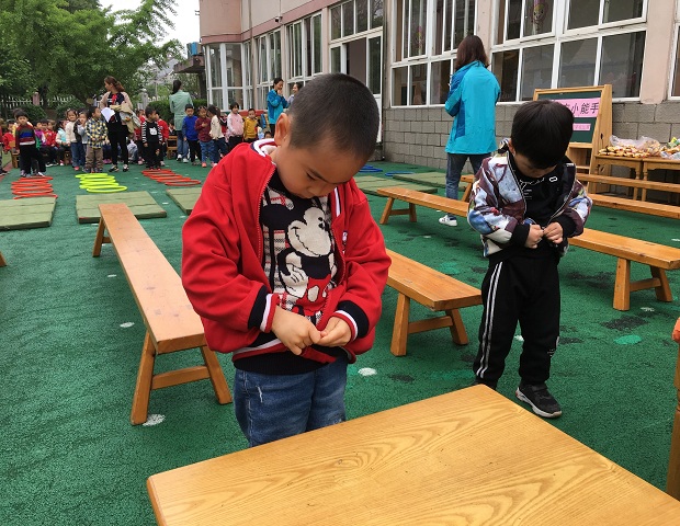 看,每个班的小选手已经排好队准备好了,只听主持人一声令下,小选手们快速地跳过五彩圈,爬过海绵垫,走到平衡木上。在平衡木上,小选手们张开双臂,有的迈着小碎步,小心翼翼地通过平衡木;有的大步向前走,生怕落后。到达穿衣服的区域,幼儿们纷纷挥着小手各显神通,有的先把帽子戴在头上,然后找衣袖;有的两手伸进袖子,将衣服使劲向后一甩拉上拉链。孩子们动作迅速利落,不甘示弱。整个比赛洋溢着紧张、欢快的氛围。操场上“加油,加油”声此起彼伏,在老师和小伙伴们的呐喊声中,每位选手情绪高昂,力争独立穿好衣服。在幼儿专注比赛的同时,各班教师也在认真、负责地为幼儿计时,统计比赛结果。最后每班评选出了一等奖8名,二等奖12名,剩下的则为三等奖。不管结果如何,孩子们的脸上都绽放出自豪的笑容,满足的神情,深深地沉浸在活动带来的欢乐中。