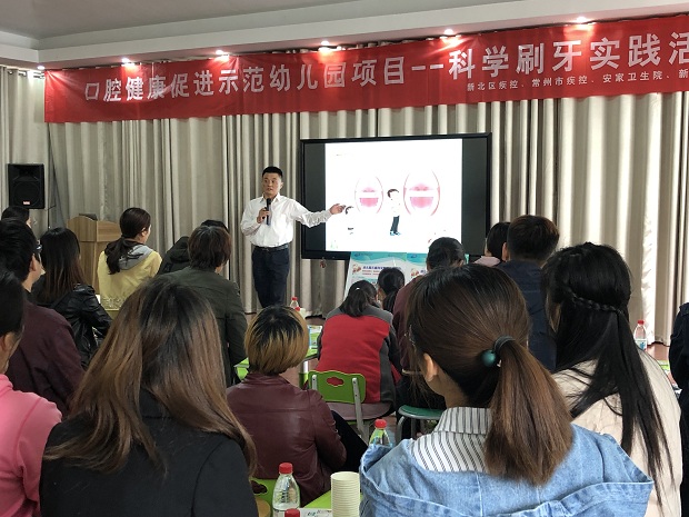 活动伊始,新北区疾控中心张友科长运用生动形象的PPT,向自愿报名的家长进行了一次关于牙齿知识的专题讲座。讲座中仔细讲解了牙齿的构造,展示了一张张健康牙齿和损坏牙齿的图片,向大家重点讲解了科学刷牙的正确方法,并在互动交流中进行了现场演示。同时,张科长还告诫我们要坚持健康饮食,少食甜食,定期检查牙齿等护牙小常识,帮助家长们树立良好的爱牙意识。