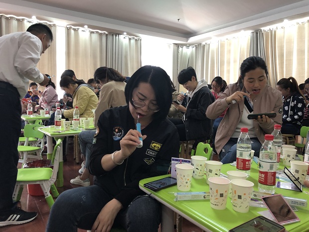 游戏“刷牙大PK”将今天的活动推向了高潮,家长和幼儿在专家的指导下进行了现场科学刷牙小游戏。大家先在牙齿上涂粉红色菌斑染色液,进行菌斑显示实验,再连接手机上的口腔健康计划app,运用科学刷牙仪照着水平颤动拂刷法,进行刷牙大PK。比赛结果让现场炸开了锅,张科长建议大家对菌斑聚集地重点刷一刷,让每一位家长知道了自己的问题所在。