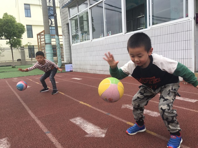 接着是激动人心的运动游戏比赛环节,首先进行的是第一个比赛项目:拍球。1分钟之内看谁拍的最多。参加拍球的小运动员们双腿分开,臀部向下,眼睛紧盯着手中的皮球,姿势都非常准确。口哨一响,孩子们迅速拍了起来,“砰砰砰”皮球砸在地上的声音厚重响亮。旁边的幼儿也就争相做起了啦啦队,为本班比赛的幼儿加油鼓劲呐喊。