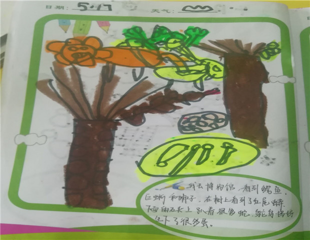 愉快的博物馆之旅结束了,但博物馆中的画面还浮现在孩子们的脑海中!瞧!孩子们回到幼儿园还用记日记的方式在和同伴们分享今天博物馆之旅的所见所闻呢!
