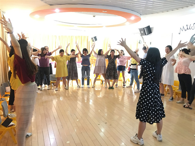 游戏结束后,何老师带着老师们一起进行了理论学习,帮助大家再次明晰了“教育戏剧”的内涵和功能。她指出:教育戏剧,从广义上是指应用在教育上的所有戏剧活动,狭义上是指“戏剧渗透学科或学习”的教学工作。其功能包括:愉快学习、自我肯定、学会沟通、学会合作、身心调控、消除恐惧、增进审美。一个主题教学活动的结构应当包括暖身活动、研讨学习、舒缓活动。
