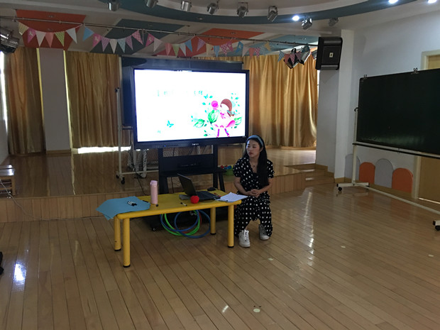 活动刚开始,主持人何俨仿老师就分享了两个之前在南京培训时学习到的适宜小班年龄特点且有趣味性的游戏:大烧饼和小笼包、玩转呼啦圈。大烧饼和小笼包的游戏中,老师们利用自己的身体部分模仿大烧饼和小笼包的特点。