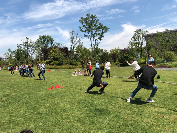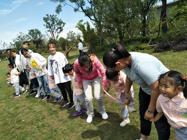 到了目的地家长和孩子徒步走入民俗公园,首先活动在亲子热身运动--胡巴胡巴拉开序幕,接下来是孩子们最期待的亲子游戏活动,本次亲子游戏为闯关活动,游戏规则:每一个幼儿和家长参与三个班级组织的游戏,每个幼儿手里必须按有不同图案的三个印章才能得到奖品。紧接着家长和孩子们进行“一圈到底”、“穿大鞋”“抢圈圈”等亲子游戏闯关活动,亲子们在相互鼓励和支持下,顺利完成了游戏闯关得到奖品。接下来拔河比赛又把游戏推入高潮,爸爸们在草坪上举行一场力量上的较量,孩子们齐心协力给爸爸们加油鼓起。在游戏时光里,孩子们快乐的身影,欢乐的笑声在阳光的照射下显得格外的美好,这份美好也同样感染到家长,所有的家长也积极地参与进来和宝贝们一起游戏,此时此刻家长仿佛回到了童年。