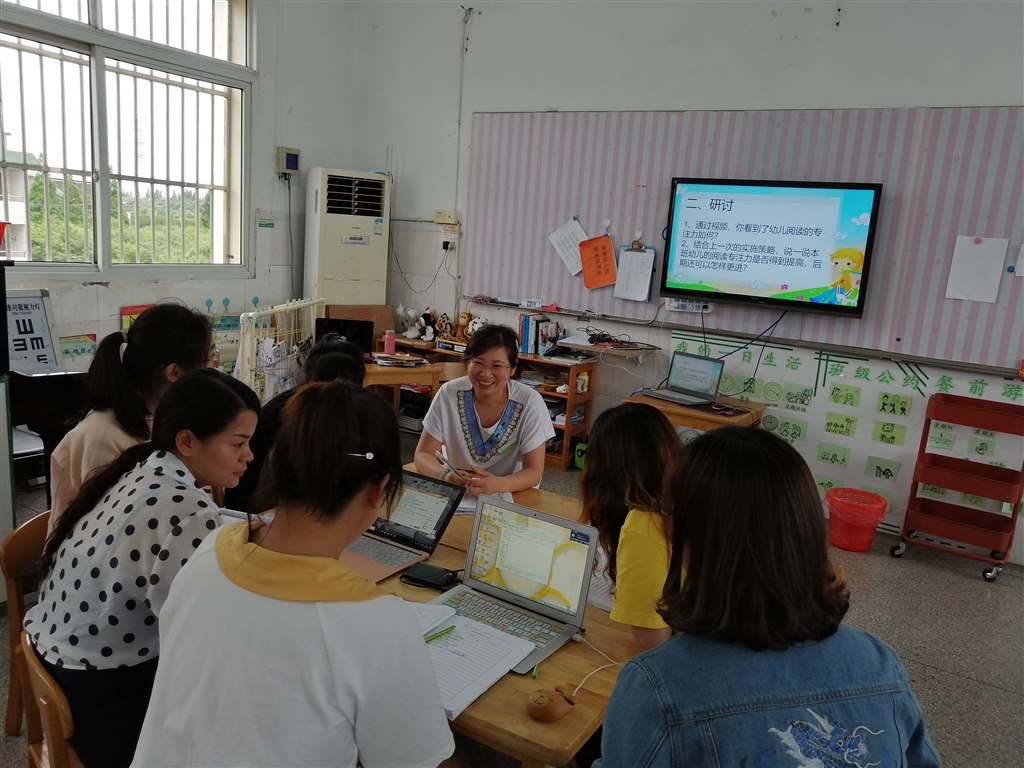 此次活动是承接上一次的研讨结果进行实施后的交流。首先主持人针对上次提出的策略,在班级实施后,以视频的方式呈现给各位老师,并说一说在实施过程中的问题和发现,其他老师在观看视频后,结合本班情况说出了自己的感受,在讨论中,老师能说出自己班孩子在阅读时的表情,以及肢体动作等,有的老师说了孩子在阅读中的进步很大,有的孩子进步较小,但是不管怎样,看到孩子们有进步,老师的教研活动就是有意义的活动。