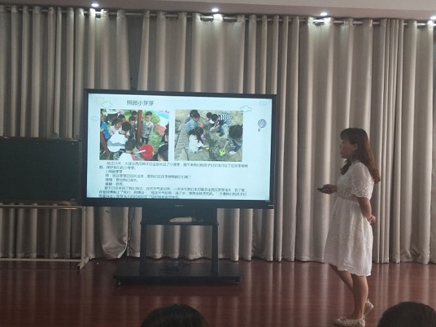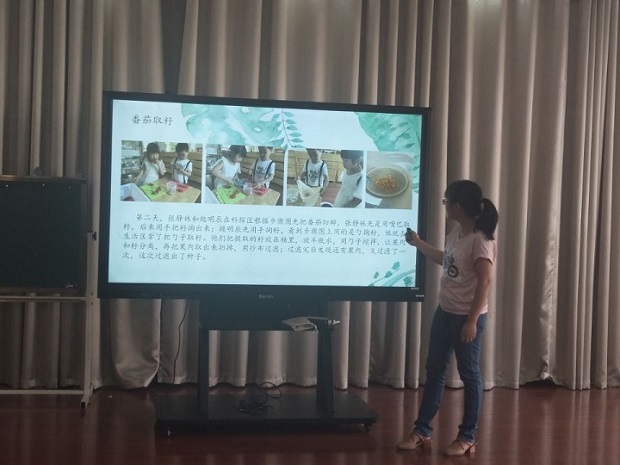 小3班施卫娟老师、中4班曹莲老师、大1班邹榴玉老师分别讲述了各班级目前开展种植课程的故事。三位教师结合图片、视频、调查表等形式,向老师们分别讲述了种植课程中发生的西瓜苗的移栽、番茄种的取种以及番茄种植的精彩课程故事。