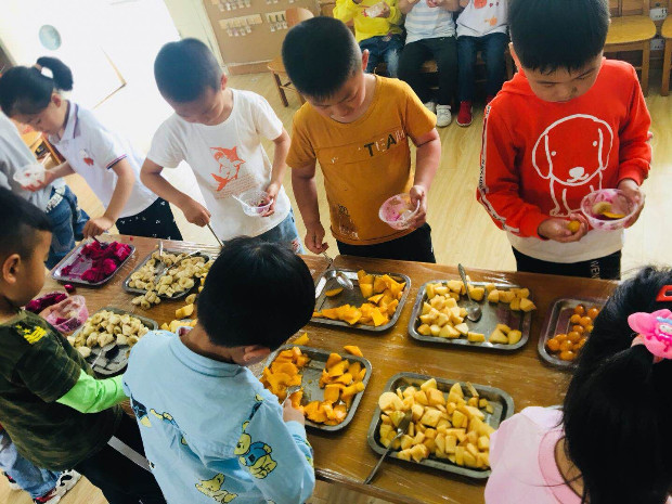 中班幼儿已形成了初步的自我意识,具有一定的自我服务能力,动手能力也有了明显提高。抓住中班幼儿的这些年龄特点,中班组教师组织了幼儿进行水果沙拉、榨果汁等活动,孩子们自主研讨材料的准备、榨汁的工具及方法,该活动不仅让幼儿学会了做力所能及的事情,体验劳动的快乐,也让幼儿从小树立以辛勤劳动为荣、以好逸恶劳为耻的意识。边欣赏电影,边品尝自己动手制作的美食,这个“六一”,给了孩子们别样的体验。