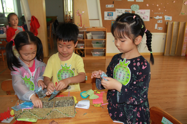 而“乐享六一巧手创意趴”更是将端午节习俗进一步延伸到游戏中,吸引着不同年段的幼儿。场馆内外随处可见孩子们精心创作的龙舟、粽子等手工作品,奇思妙想的“端午习俗版画”、“龙舟百舸争鸣”等微景观。而当天的游戏更是传统和时尚的巧妙融合:激萌手绘馆,孩子们用脸部彩绘重现“端午画额”的乐趣;奇趣蛋蛋馆,用现代的绘画和巧妙的折纸再续端午和“蛋”的约会;龙腾虎跃馆,孩子们飞舞着自制的神龙兴高采烈;古韵香囊馆,每个孩子都为能携带那充满艾草香味的香囊而感到振奋人心……孩子们徜徉其中,边游戏边领略着端午创意手工的魅力。