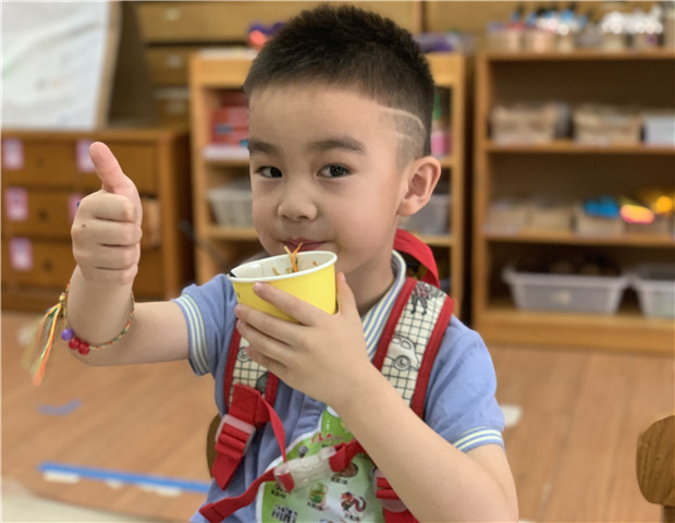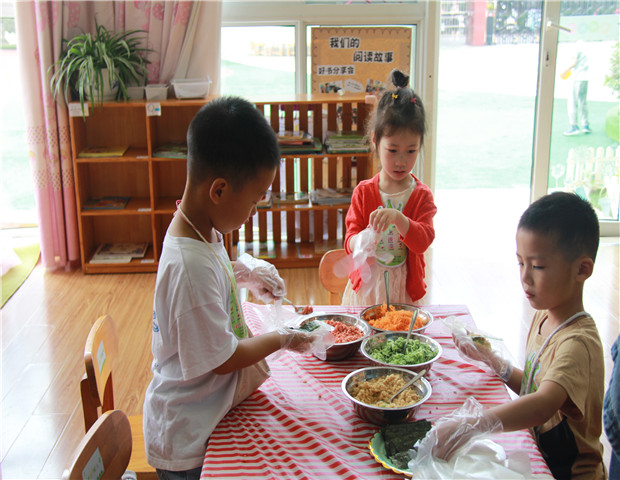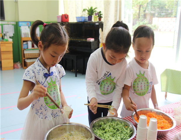 特色小吃,美味饮品,传统面食,琳琅满目的中华各地美食挑逗孩子们的味蕾。活动当天的缤纷美食趴有吃有喝,更有实践,让孩子们自我服务,品尝美食的同时,感受着“舌尖上的中国”。当简单的食材和幼儿们灵巧的双手相遇时,一道道各具特色的美食就悄然诞生了:北京糖葫芦、陕西凉面、缤纷果汁、美味饭团……幼儿在家长志愿者和老师的引导中认真操作体验着,你剥皮来我来切、你涂酱来我来卷,充分享受了视觉的欢愉、味觉的快乐,以及动手操作的成就与满足。
